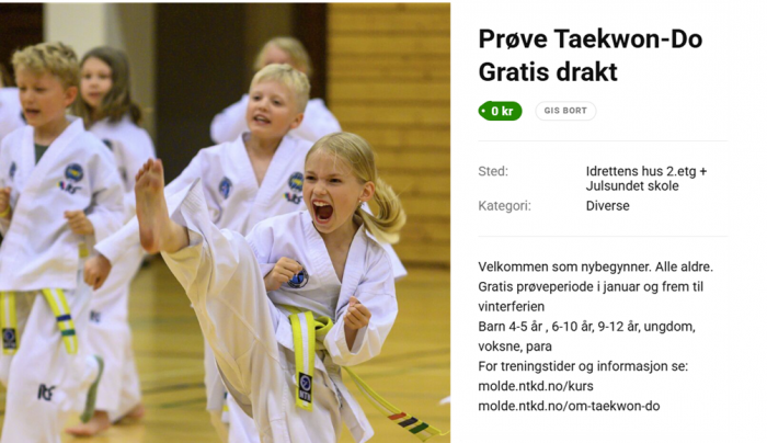 Er du 4 år, 40 år eller 80 år, så er Taekwon-Do en svært allsidig sport som kan passe for alle. Store og små, familie og venner, om man vil bli verdensmester eller ønsker å trene for å ha det gøy, så har Molde Taekwon-Do klubb plass til deg. Hos oss kan du trene gratis hele januar for å finne ut om Taekwon-Do er sporten for deg. Les her om Taekwon-Do og registrer deg om du ønsker å prøve https://molde.ntkd.no/node/14172